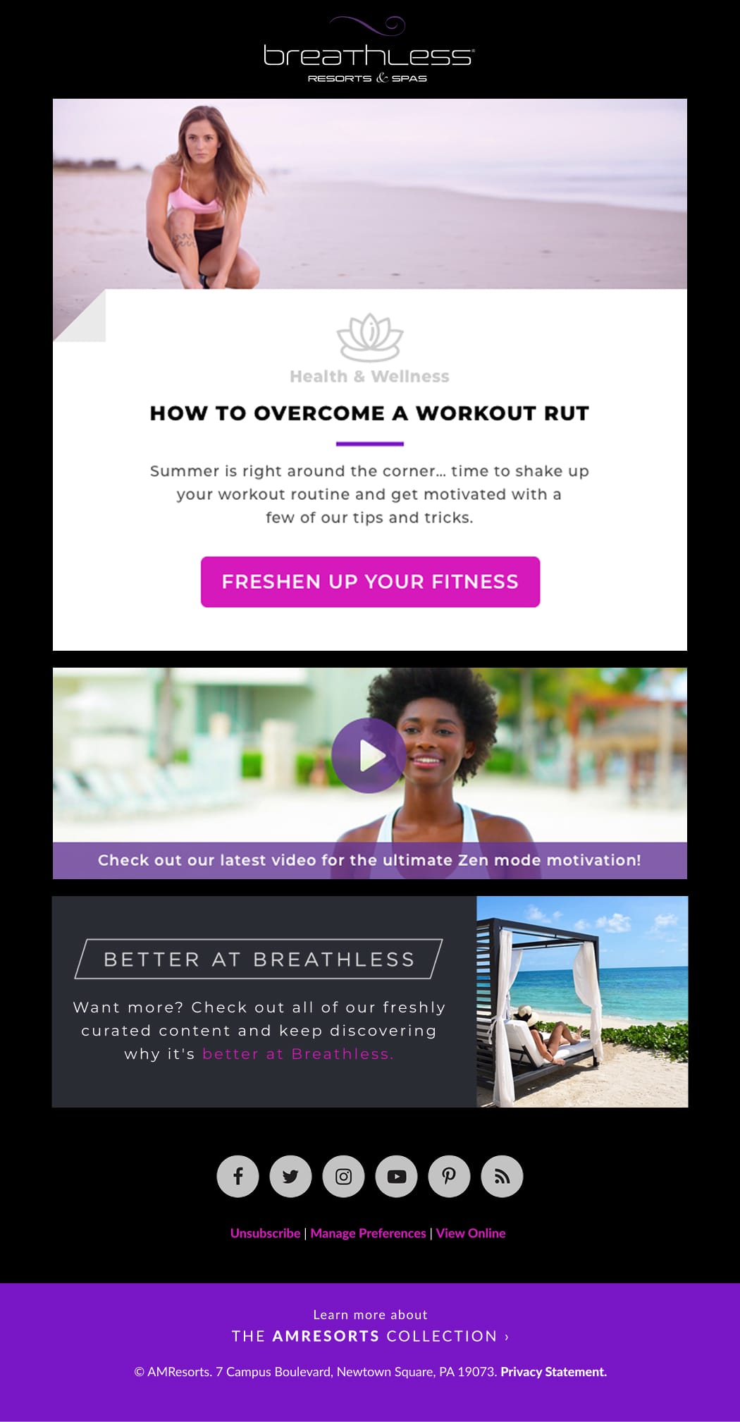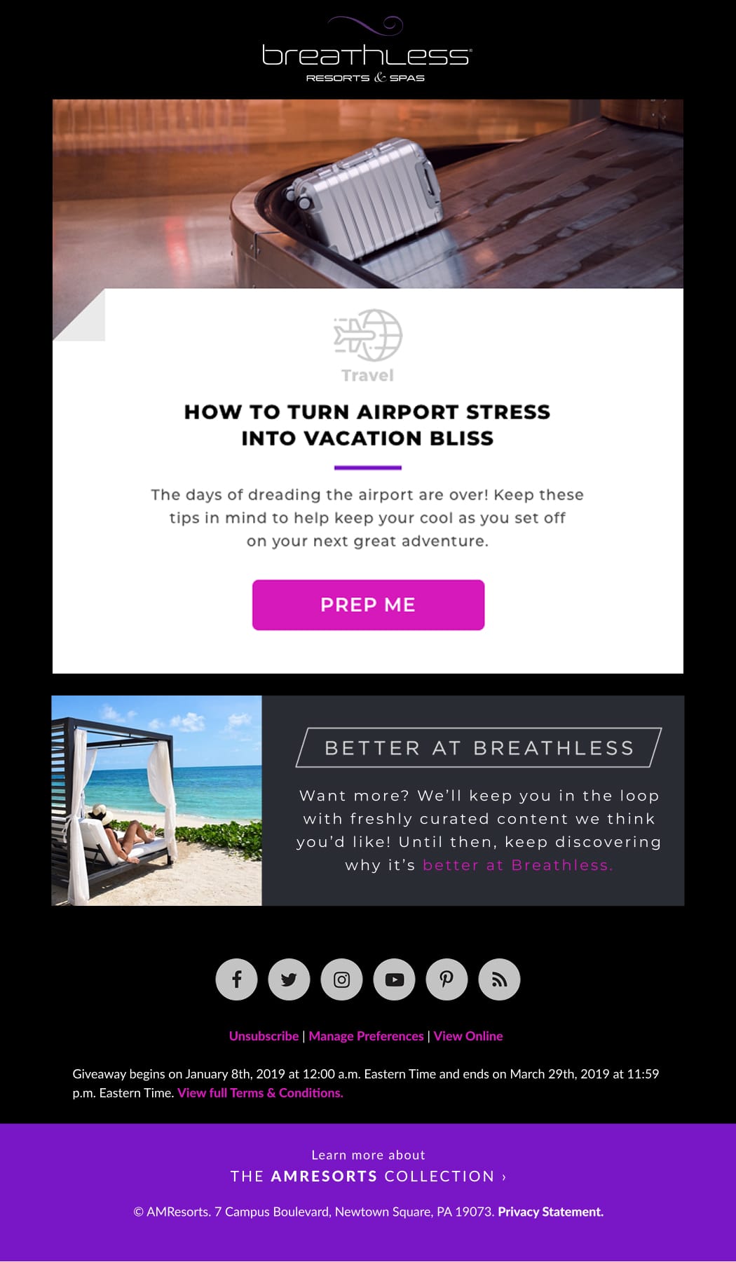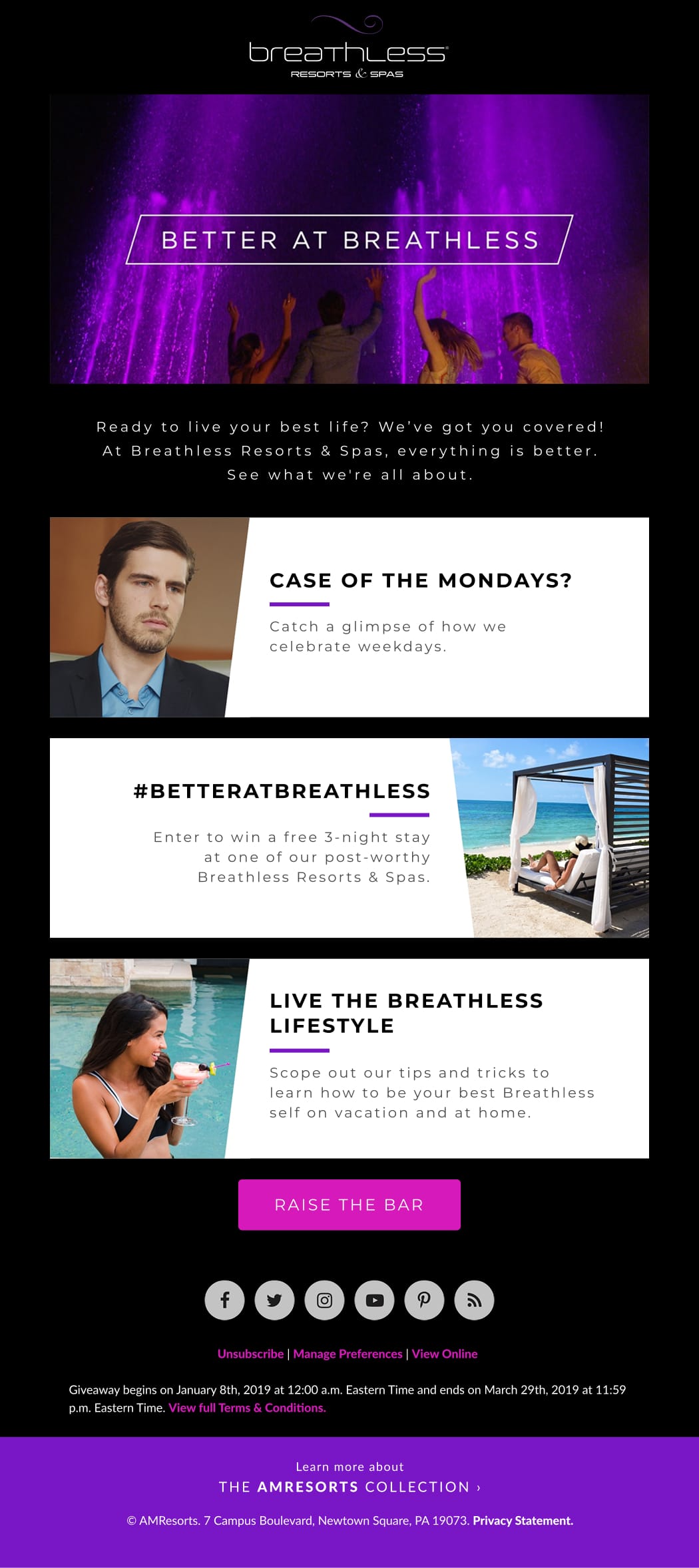I created and managed a dynamic email series to introduce a new brand awareness campaign for Breathless Resorts & Spas, designed to highlight the brand’s energetic and luxurious identity.