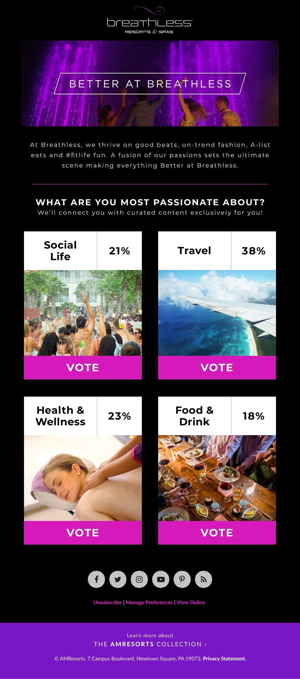 The series began with a launch email that invited subscribers to experience the Breathless lifestyle through vibrant imagery and bold messaging. It was followed by an interactive poll email that encouraged audience participation by asking subscribers to vote for the topic that interests them most—including travel, food & drink, health & wellness and social life.