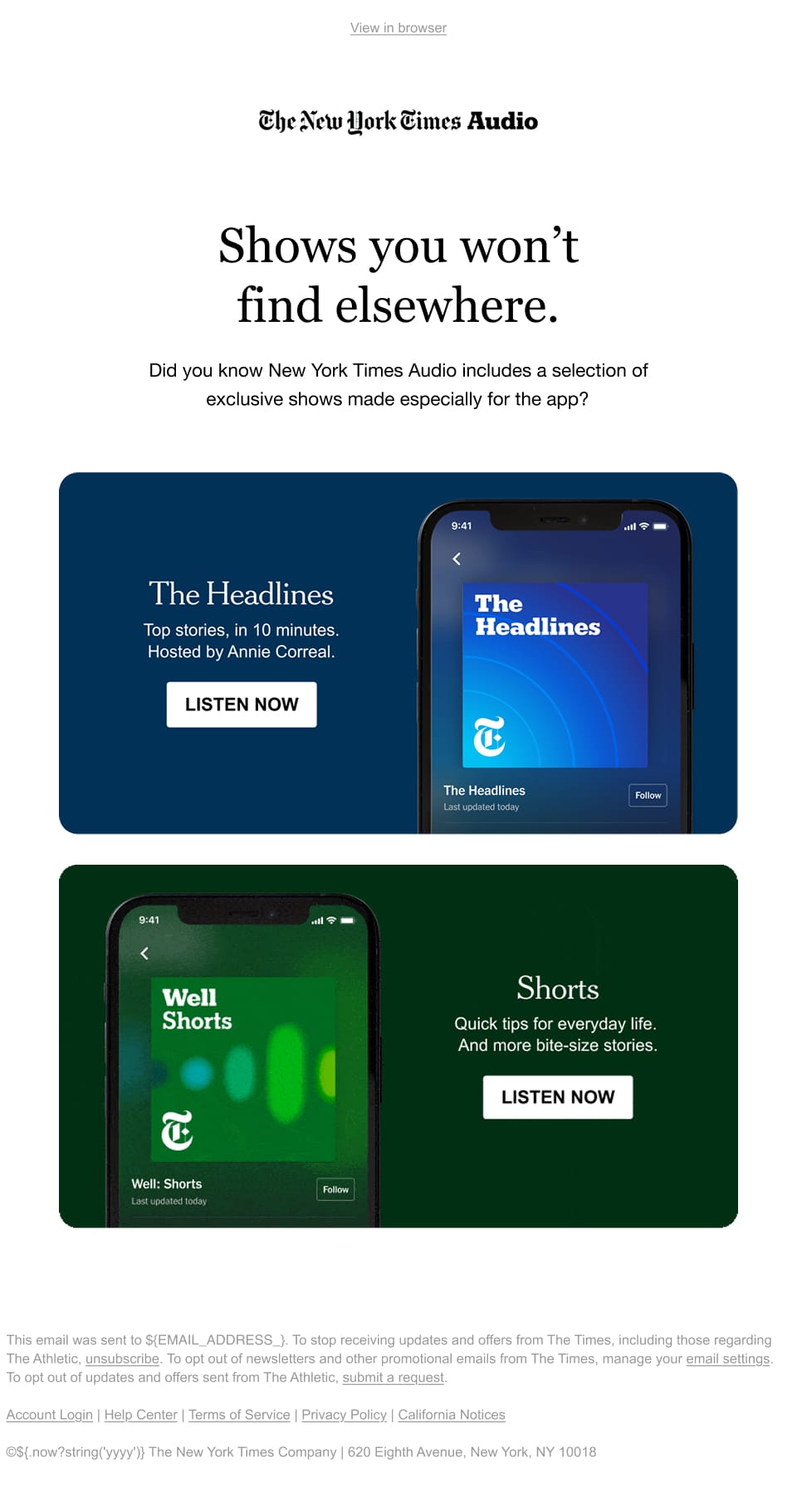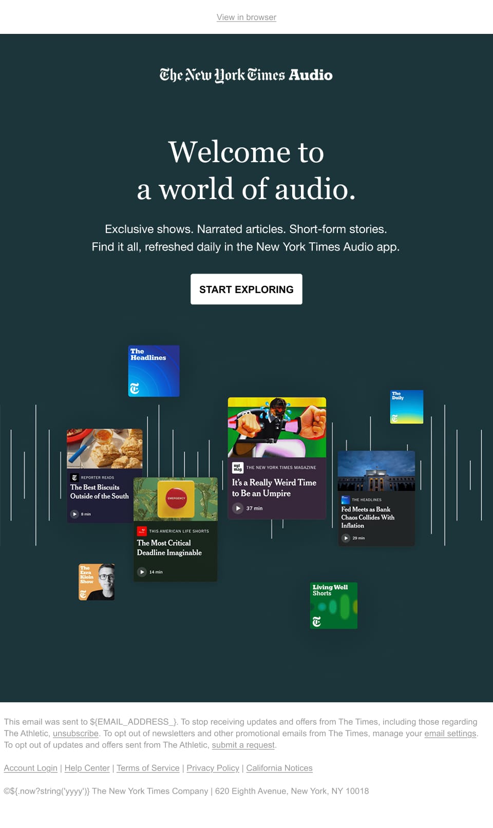 I created a multi-part email series to introduce The New York Times Audio app, a new product launched in 2023 that brings the best of The Times’ journalism, podcasts, and narrated articles together in one seamless listening experience.